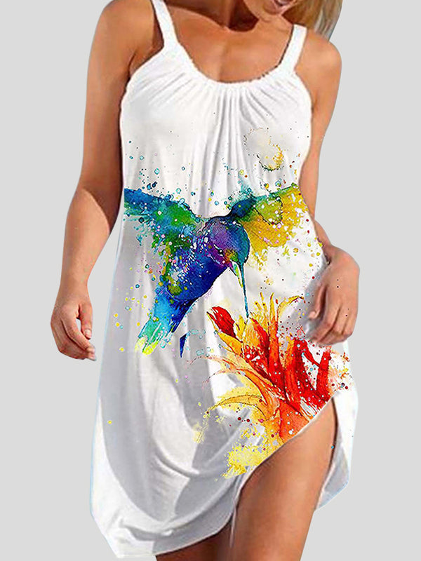 A-Line Loose Animal Printed Pleated Spaghetti-Neck Mini Dresses