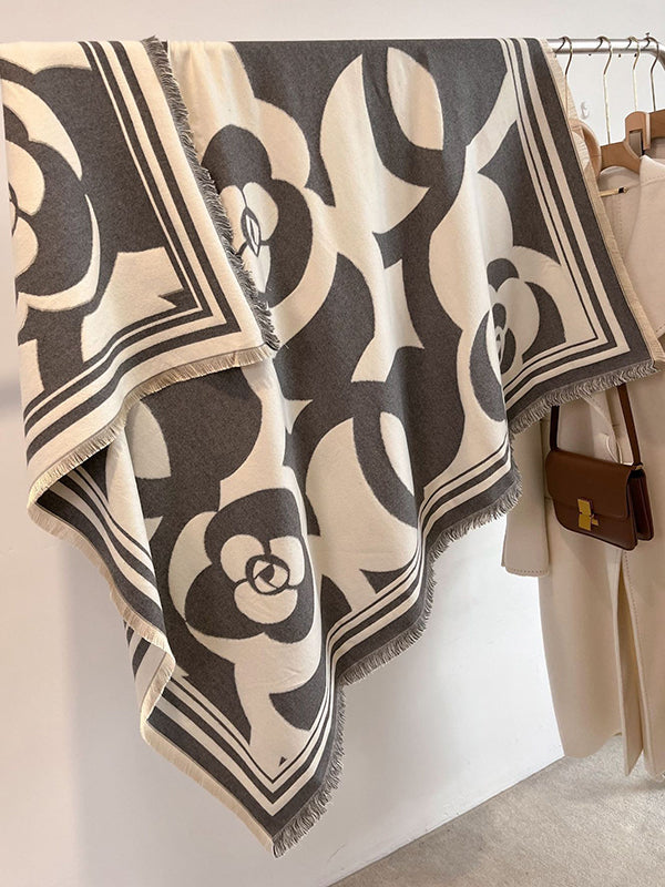 Contrast Color Fringed Keep Warm Knitted Flower Striped Shawl&Scarf