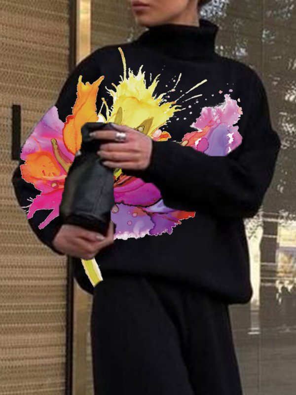 Long Sleeves Loose Flower Print Split-Joint High Neck Sweatshirt Tops
