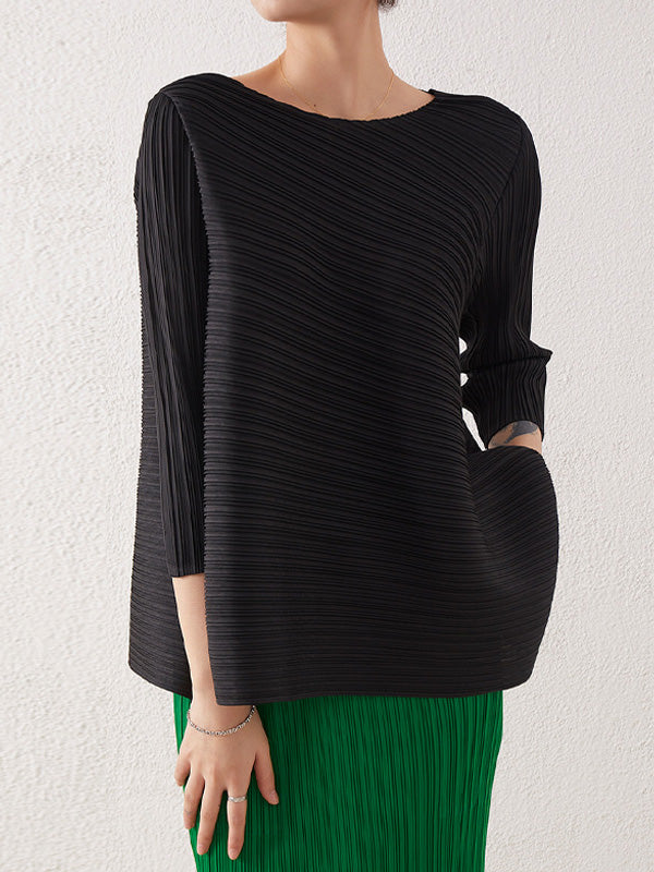 Simple Three-Quarter Sleeves Loose Pleated Solid Color Round-Neck T-Shirts Tops